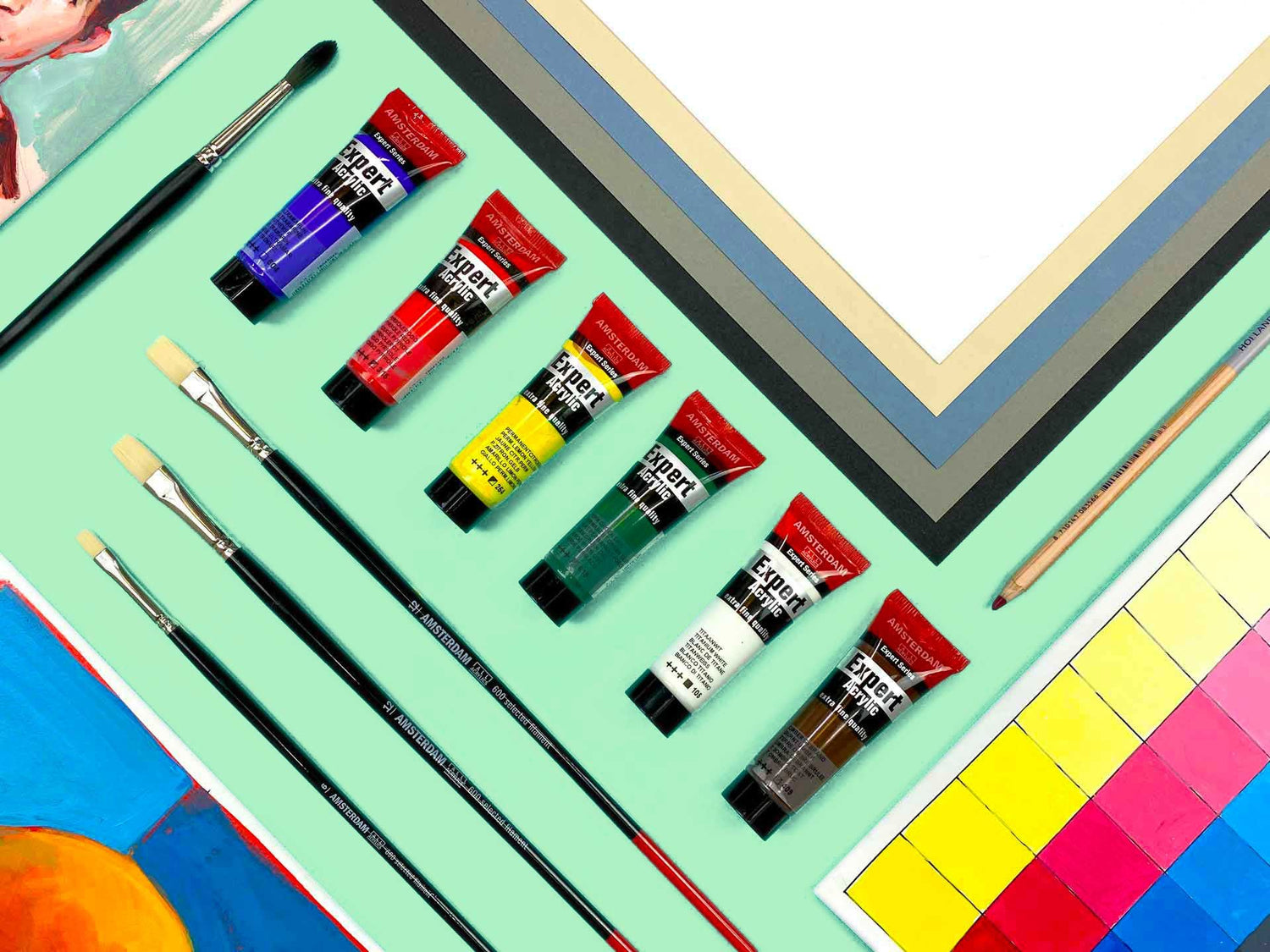 - 5 tubes d'acrylique Amsterdam Expert, cette acrylique extra fine vous permettra de bénéficier de couleurs vives et très couvrantes.